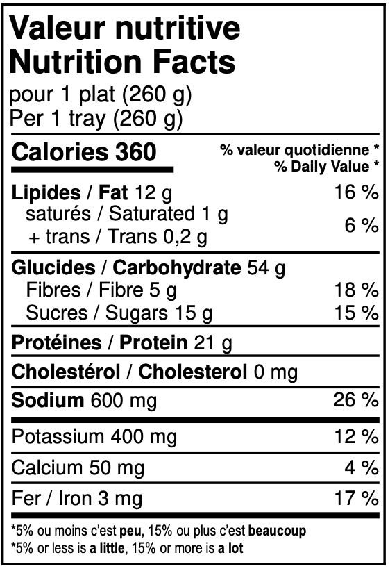 Ingredients: Sauce (water, onion, mushroom, tomato paste, sugar, hydrolyzed soy protein, green bell pepper, celery, canola oil, modified corn starch, garlic, spices, yeast extract, herbs), Cooked pasta (water, durum wheat semolina, canola oil), Seitan strips (water, wheat gluten, wheat flour, canola oil), Red bell peppers.
