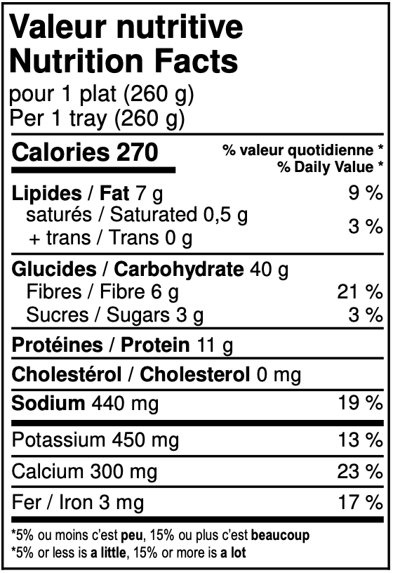 Ingredients: Sauce (tomatoes, water, onion, zucchini, carrot, red bell pepper, hydrolyzed soy protein, canola oil, modified corn starch, garlic, salt, spices, herbs, potassium chloride), Cooked basmati rice (water, basmati rice, canola oil), Tofu (filtered water, soybean, calcium sulfate).