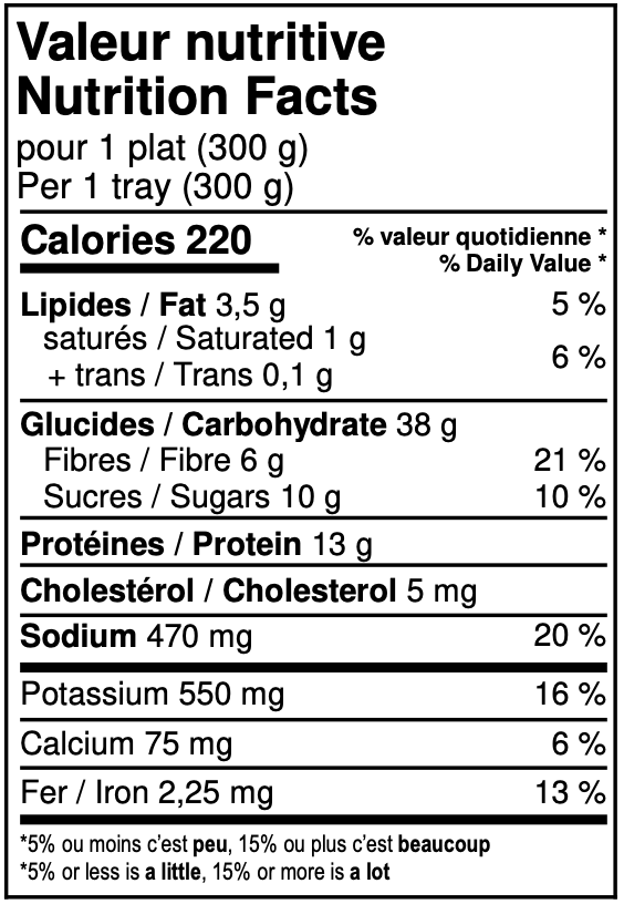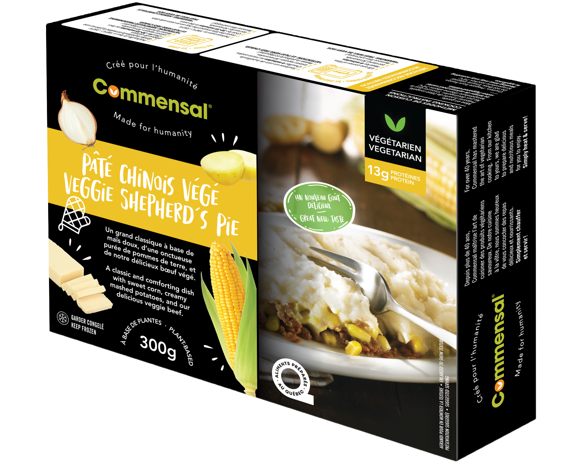 Ingredients: Mashed potatoes (water, potatoes, butter, sea salt, irradiated spices), Sauce (water, corn, textured soy protein, onion, sugar, hydrolyzed soy protein, tomato paste, canola oil, yeast extract, garlic, modified corn starch, spices, caramel), Corn.