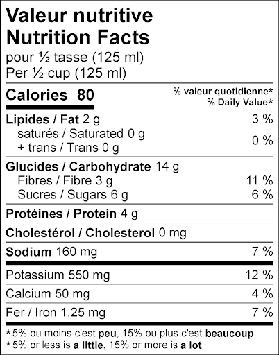Ingredients: Water, Tomatoes, Tomato puree, Carrots, Lima beans, Onions, Butternut squash, Turnip, Kale, White beans, Wheat orzo, Natural flavour, Canola oil, Garlic, Herbs, Sea salt, Yeast extract, Spices.